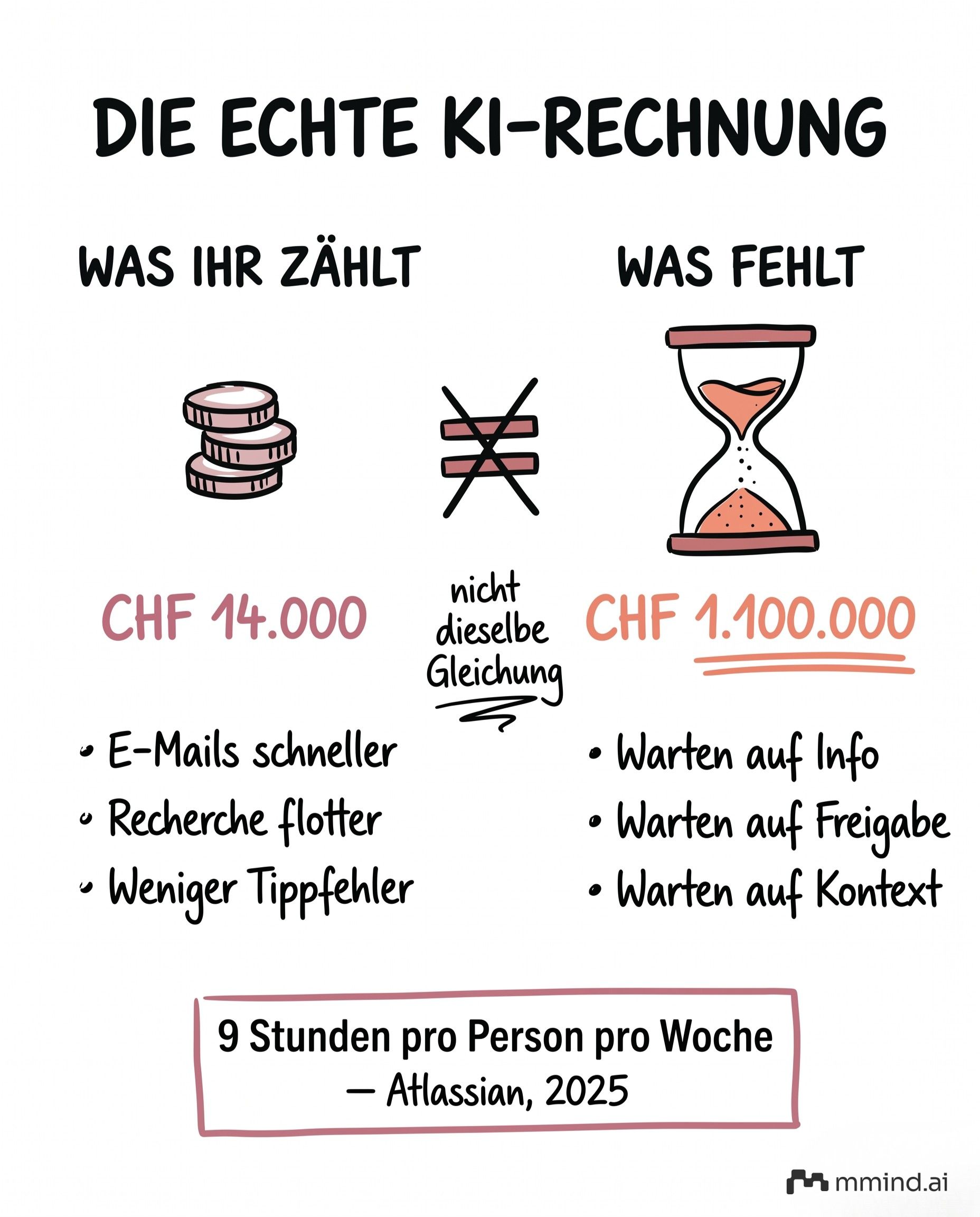 Neun Stunden pro Woche. Pro Person. Mal 40 Personen. Mal 52 Wochen. In einem KMU mit durchschnittlichen Lohnkosten von 120.000 Franken pro Vollzeitstelle sind das rund 1,1 Millionen Franken pro Jahr, die zwischen den Menschen versickern, nicht innerhalb ihrer Aufgaben.