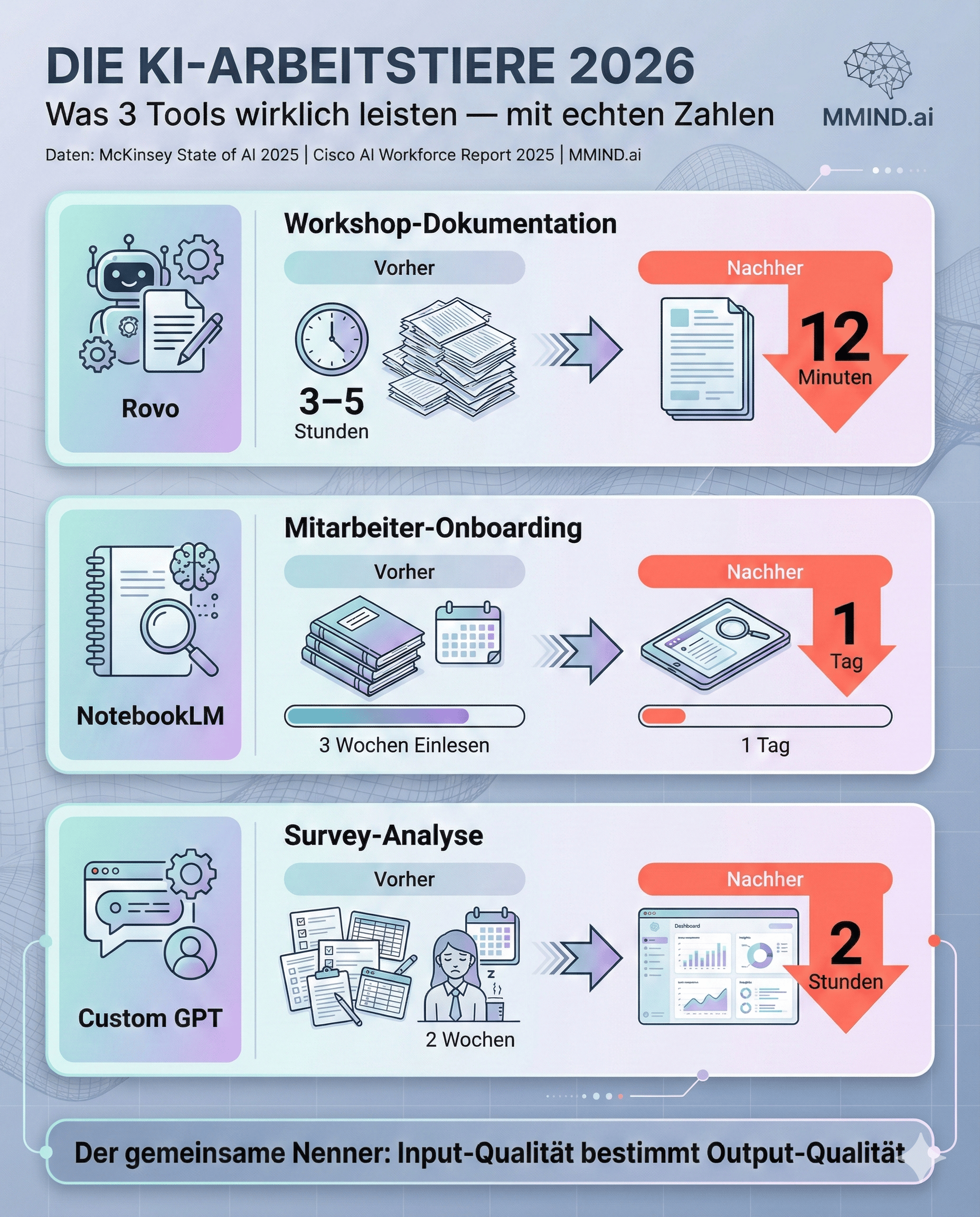 Rovo, NotebookLM, Custom GPTs — das sind keine Spielzeuge. Das sind Arbeitstiere. Tools, die ganze Aufgaben übernehmen. Nicht „E-Mail zusammenfassen". Sondern: Workshop dokumentieren, Mitarbeiter einarbeiten, tausende Datenpunkte auswerten.